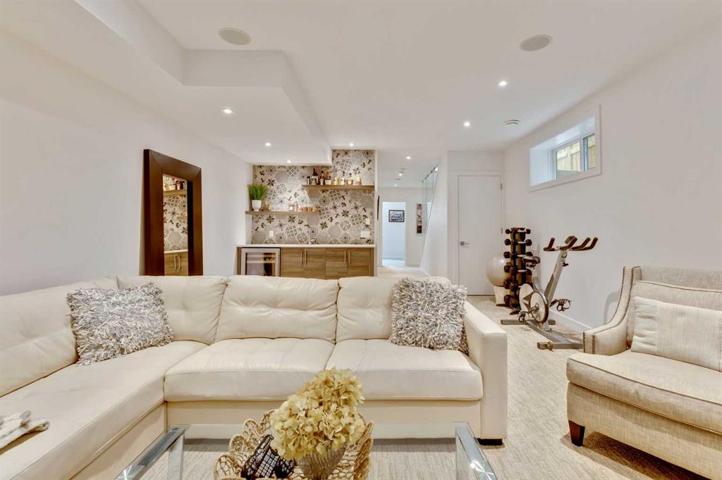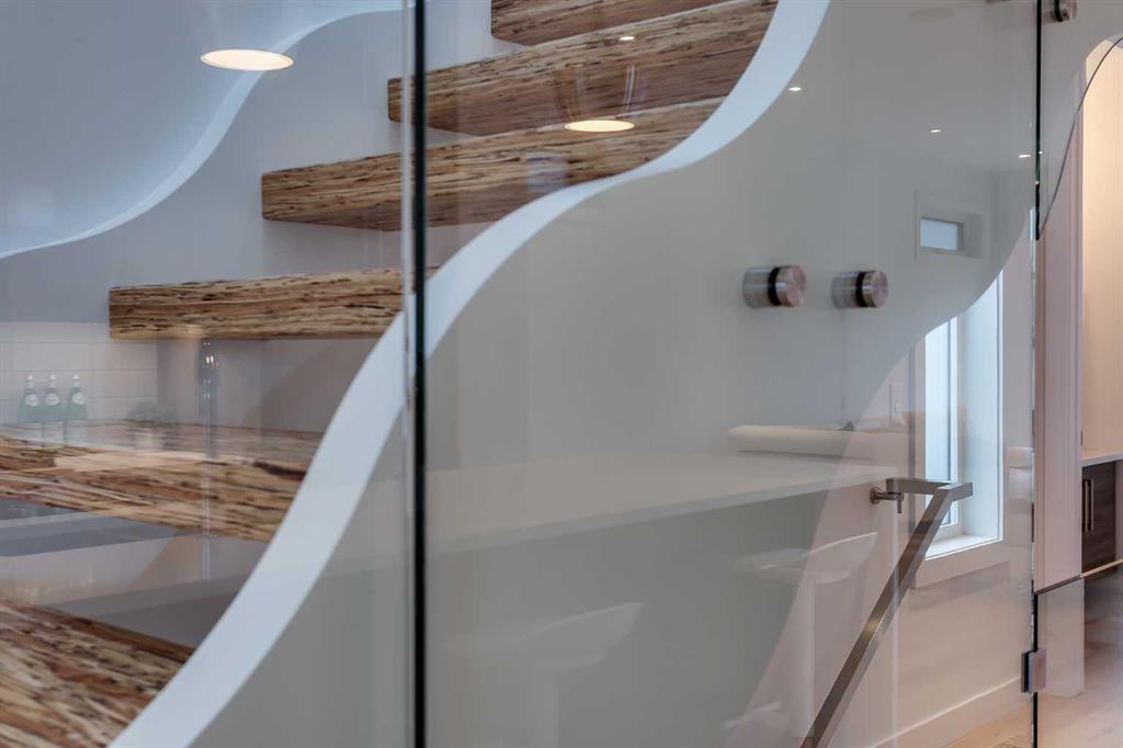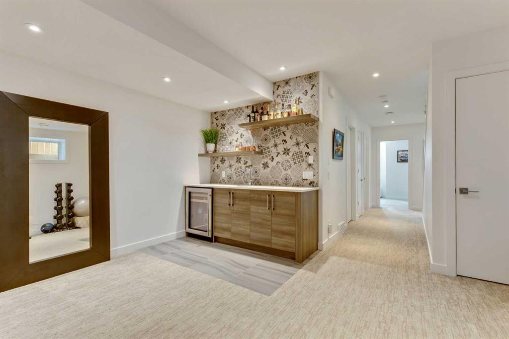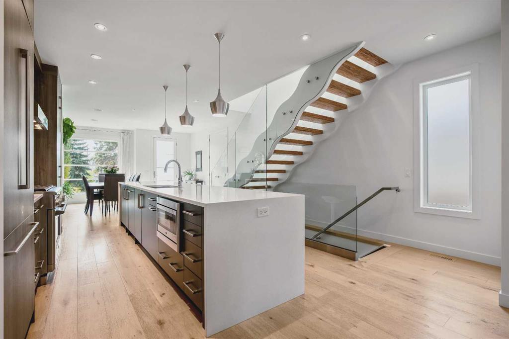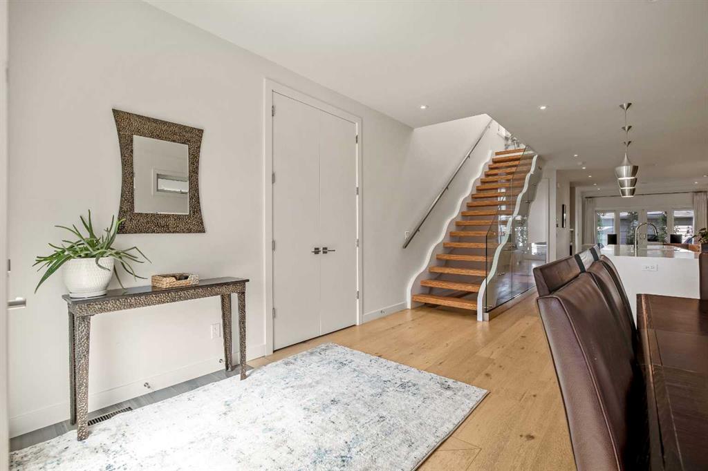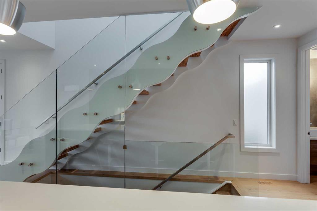 Perfectly positioned in desirable North Glenmore Park, this beautifully designed infill offers over 2,600 sq ft of developed living space just steps from the Glenmore Reservoir pathways and Aquatic Centre, along with some of Calgary’s best recreation amenities. Enjoy a highly walkable lifestyle with close proximity to the Glenmore Aquatic Centre, Stu Peppard Arena, the new Glenmore Twin Arenas (currently under construction), the outdoor track and field facility, Tennis Centre, Garrison Curling Club, Crowchild Twin Arenas, and the Elbow River pathway system connecting to the Glenmore Reservoir. Nearby golf options include Earl Grey Golf Club and Lakeview Golf Course, along with excellent local schools including two high schools and St. James School. Inside, the home showcases exceptional craftsmanship and modern design. The main level features 9-foot ceilings and engineered hardwood flooring throughout, creating a bright and welcoming atmosphere. A spacious front dining area flows seamlessly into the heart of the home — a chef-inspired kitchen complete with Bosch and GE appliances, gas cooktop, wine fridge, extended cabinetry, soft-close drawers, and a striking quartz waterfall island with seating for six. The lifestyle living room centers around a custom gas fireplace and includes built-in speakers, upper transom windows, and easy access to both the mudroom and outdoor living space. A striking architectural double-stringer staircase with exposed paralam treads and sleek glass railing leads to the upper level. Upstairs, vaulted ceilings and skylights create an open and airy feel. Two spacious children's bedrooms share a well-appointed 4-piece bathroom, while a convenient upper-level laundry room is tucked behind a stylish barn door. The front primary retreat offers a walk-in closet designed for two and a spa-inspired 5-piece ensuite featuring a freestanding tub, oversized tiled shower, and dual vanities. The fully developed lower level is ideal for entertaining, complete with a large recreation room, wet bar, fourth bedroom, 4-piece bathroom, and additional storage. Outside, the garden-sized deck provides the perfect space for summer evenings or cozy fall gatherings, while the double detached garage completes the property. With quick access to downtown and close proximity to local shops, Wild Rose Brewery, The Garrison Pub & Eatery, and the vibrant amenities of Marda Loop, this home offers the perfect balance of luxury living and an active Calgary lifestyle.